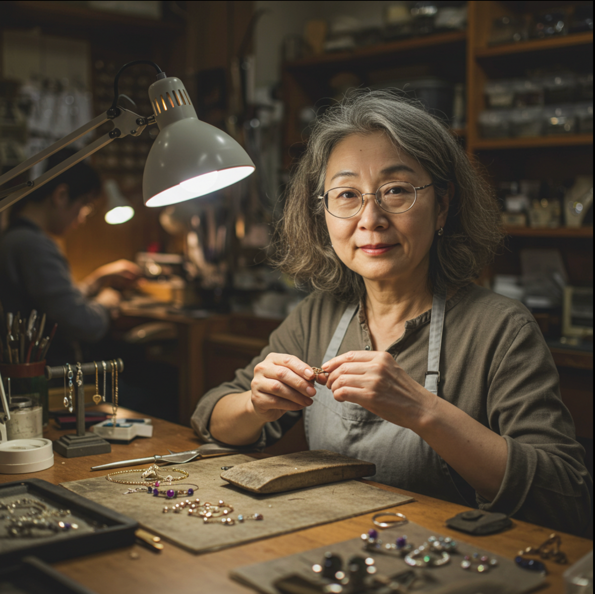 手作りのジュエリーの世界へようこそ。私は恵子と申します。27年にわたり、ジュエリー作りの技術を磨き続けてきました。一点一点、最上級の素材を使い、あなたのために心を込じて丁寧に仕上げています。